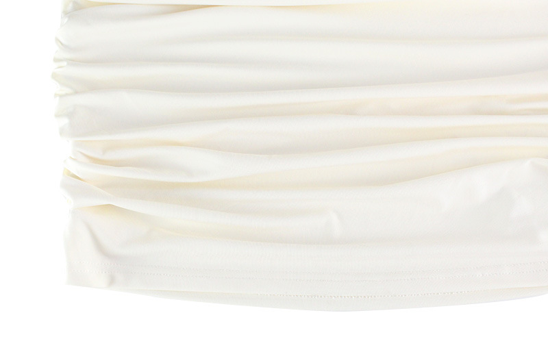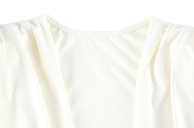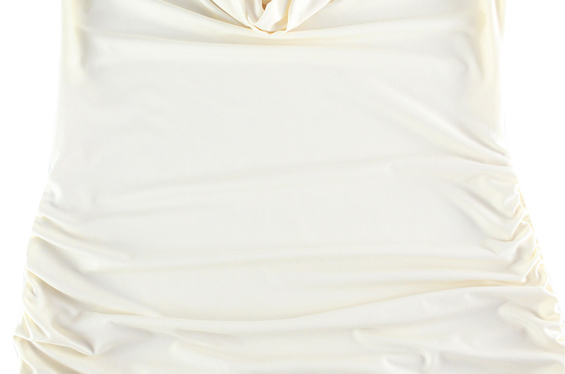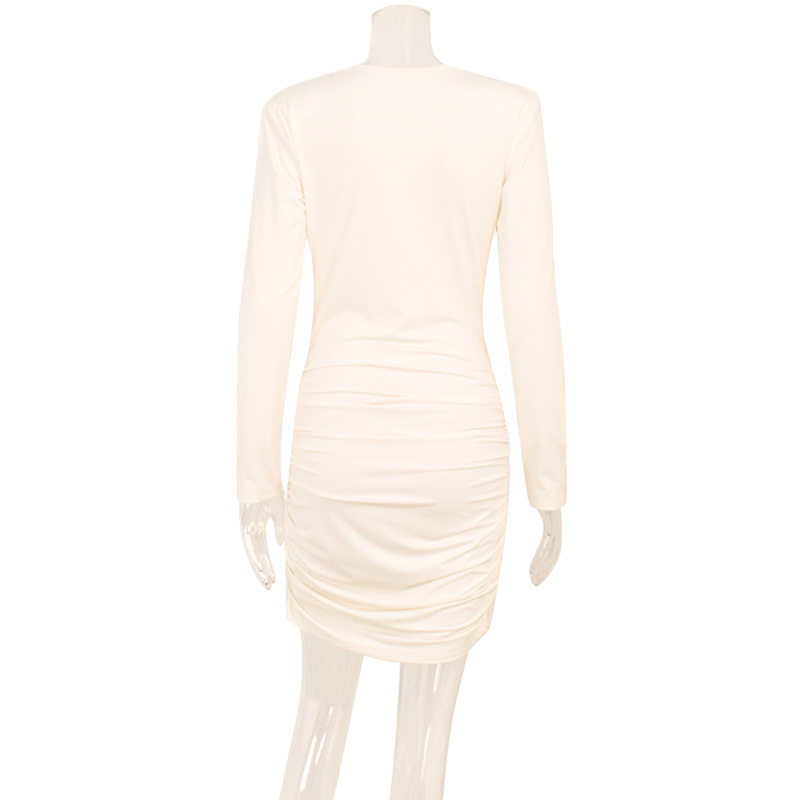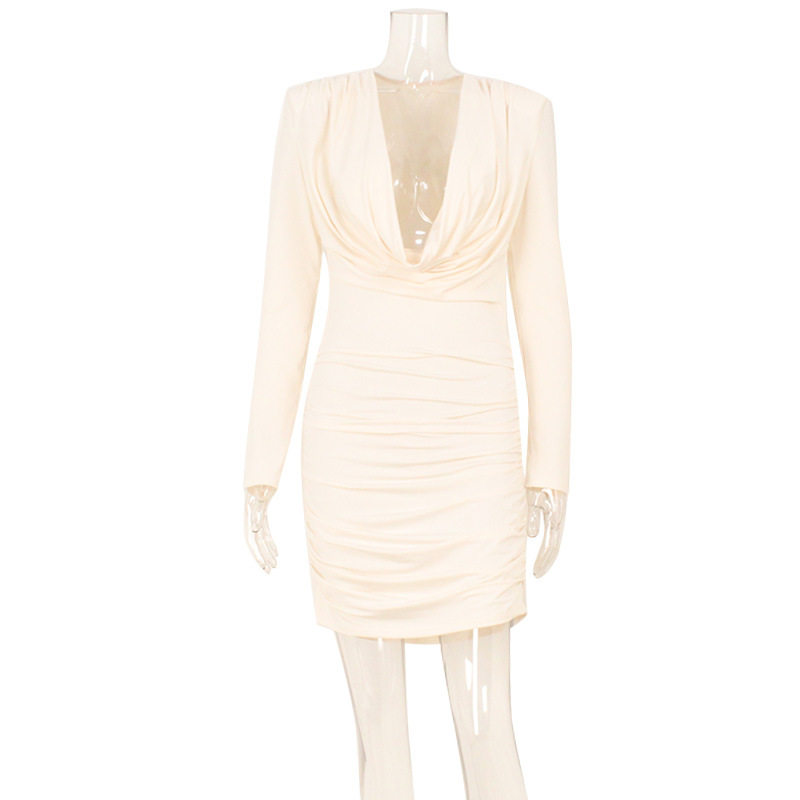 1.This piece perfectly balances bold structure with elegant draping. Featuring iconic 80s-inspired padded shoulders and a dramatic deep-V plunge, it’s designed for those who want to make a statement. The ruched bodycon fit hugs the curves beautifully while the soft, creme-toned fabric provides a luxurious, ethereal look.